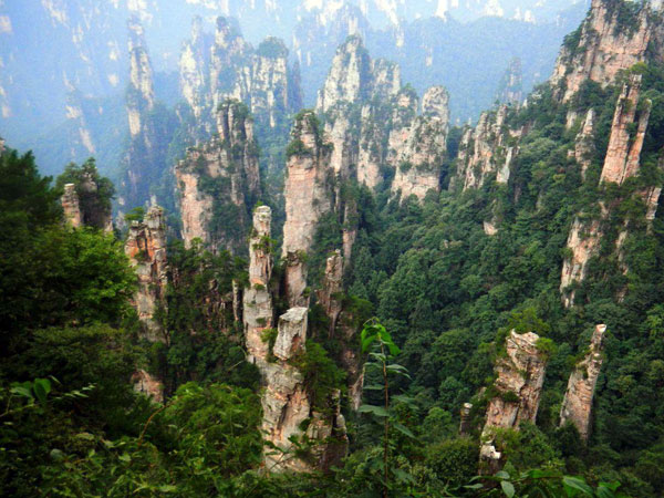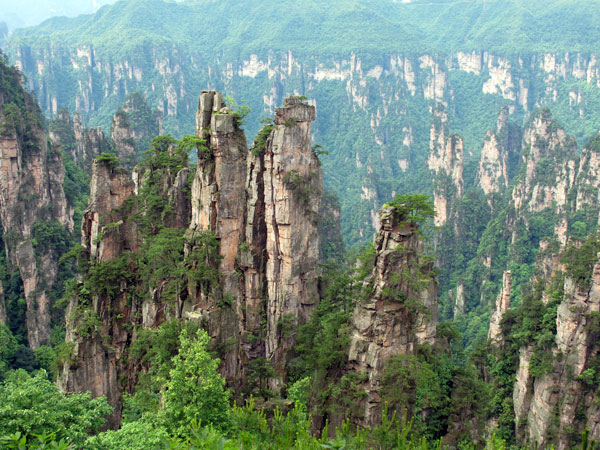 Zhangjiajie National Forest Park is located in the southern part of the Wulingyuan Scenic Zone. The several thousand mountain peaks of quartz rise abruptly from the ground. Streams flow through the Jinbian (Gold Whip) Stream Grand Canyon which is flanked by sheer cliffs. The sightseeing platform at Huangshi Village is shrouded in mist. Wild animals (especially the macaque monkeys) play freely in the primeval forests. The scenic zone is like a fairy land with the beauty of wild nature.