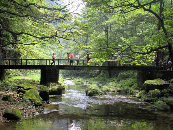 Located in the east of Zhangjiajie National Forest Park and named after the 380-meter high Golden Whip Rock, Golden Whip stream meanders 15 Li. Flowing from Laomo Gully first to Confluence of Four Rivers then to Suoxi Stream, it finally joins Li River, one of the four rivers in Hunan Province. It flows between steep grotesque peaks and luxuriant trees. Here, the meandering streams, the crystal-clear waterfalls, exotic plants and rare animals co-exist and constitute the extraordinarily beautiful, tranquil and natural ecological environment. No wonder it is called "the most beautiful valley in the world" and "the most poetic stream". The major scenic spots include Rock of Welcoming Guests, Golden Whip Rock, Reunion Rock and the Purple Grass Pond.